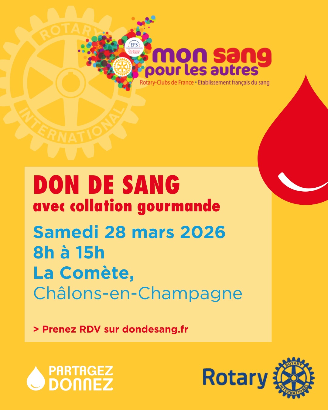 Pour la quatrième année le Rotary-Club de Châlons-en-Champagne s’associe avec l’Etablissement français du Sang (EFS) pour organiser le samedi 28 mars 2026 à la Comète un don du sang. Nous organisons une grande collecte de sang publique parce que nous manquons de sang dans notre département. Ce geste généreux peut permettre de sauver des vies