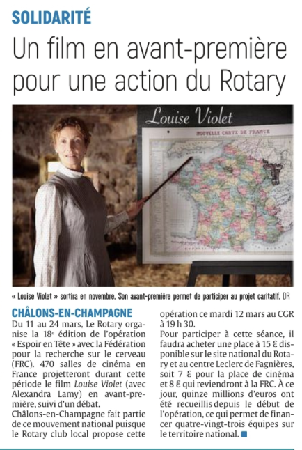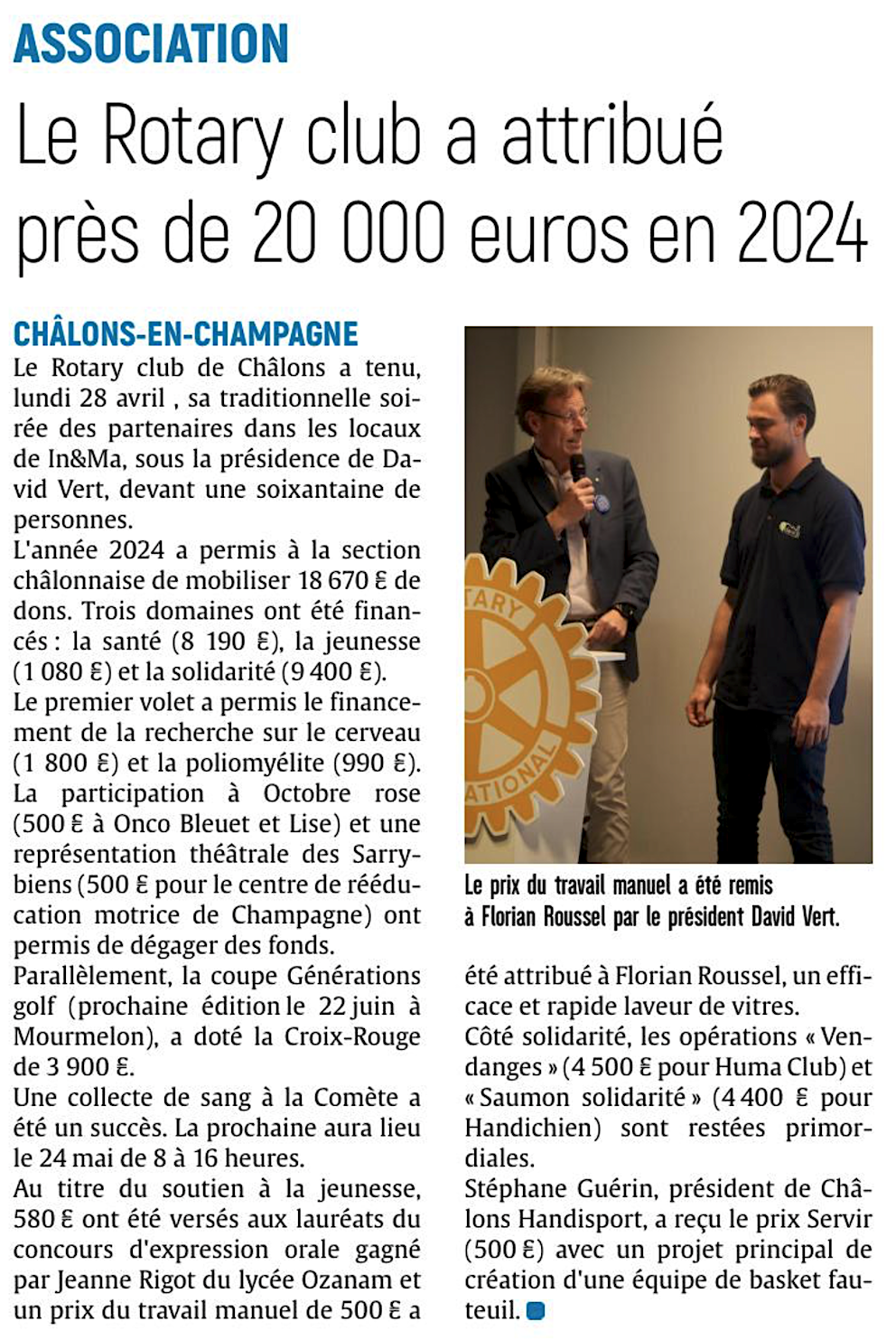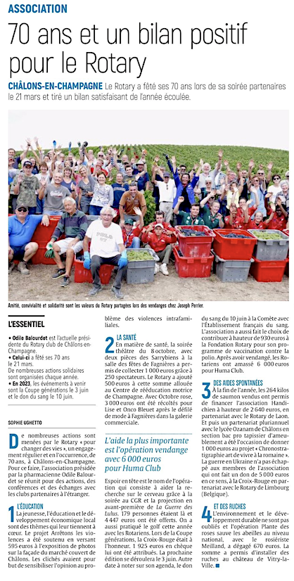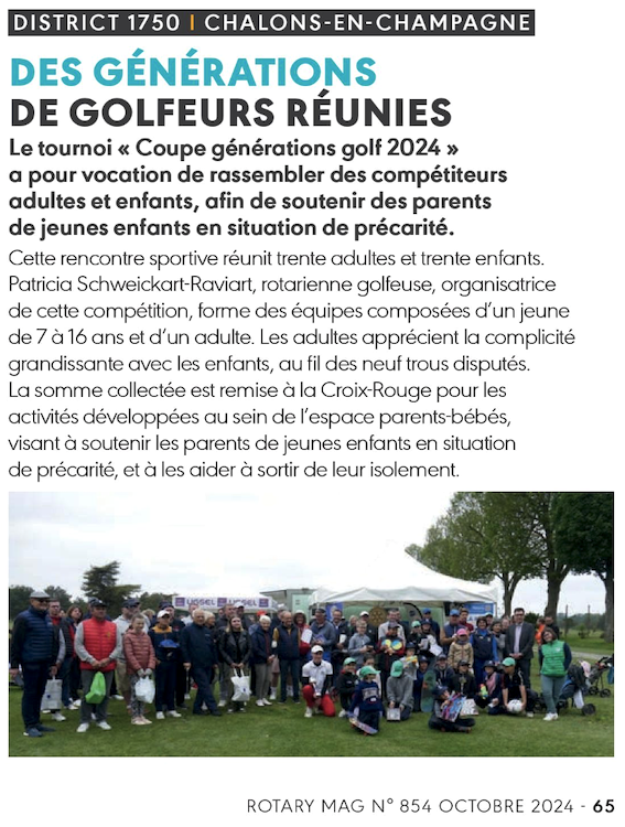 LES ARTICLES DE PRESSE 2021 Vendanges 2021 Un cabaret pour le CNAC 2022 Gala caritatif 2022 Le chien Prof 2022 Un défilé qui fait sensation 2022 Un film pour le cerveau 2022 70 ans de Rotary 2022 Le dernier Châlons… 2024 Espoir en Tête 2024 Du golf pour la bonne cause 2024 David Président 2024 Article le Rotarien golf 02-05-2025 Soirée des Partenaires 02-07-2025 Générations Golf 14-10-2025 Concert F. Attesti RETOUR AUX ACTUS DU CLUB